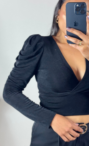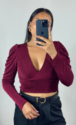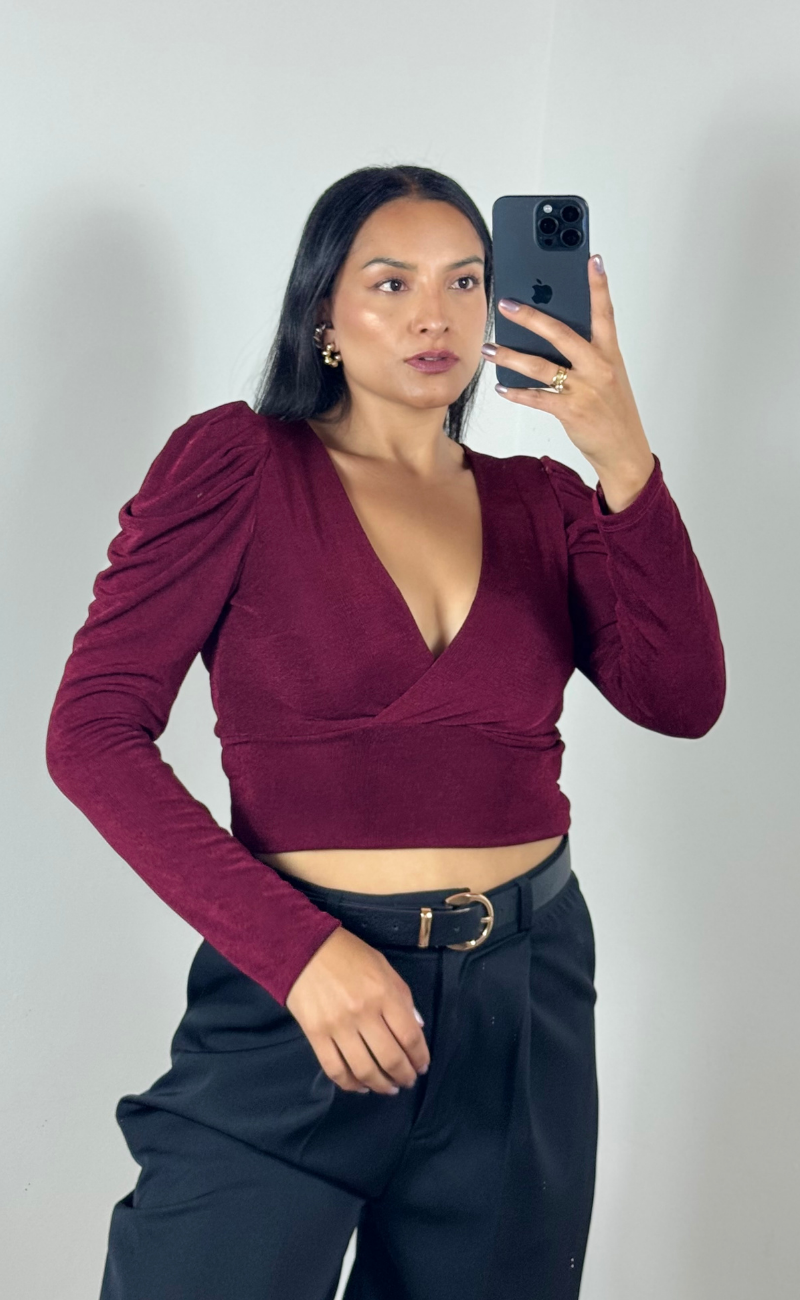 Blusa corta con escote en V y mangas puff- Negro y Vino Tinto