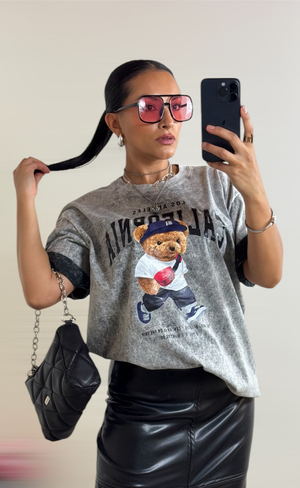 Su color gris humo es moderno y fácil de combinar, mientras que el estampado de osito le da ese toque cool y divertido que transforma un look básico en uno con personalidad. El cuello en rib mantiene su forma lavado tras lavado.