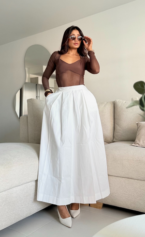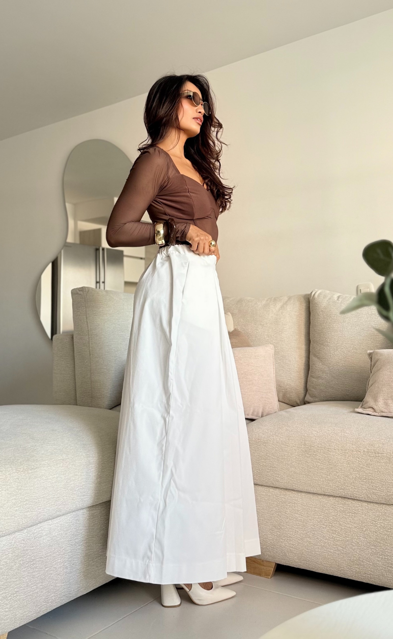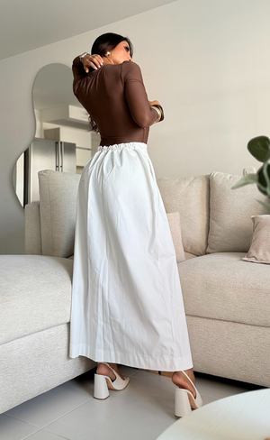 La falda larga en dril es un must-have atemporal que nunca pasa de moda.