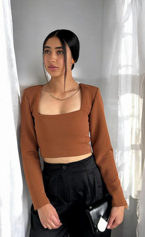 Su cuello cuadrado realza el escote de manera elegante, mientras que la manga larga y las hombreras integradas aportan un fit más definido y estilizado, destacando la parte superior del cuerpo.
