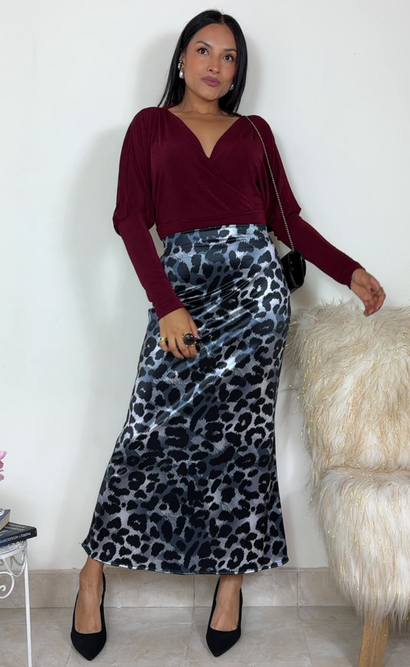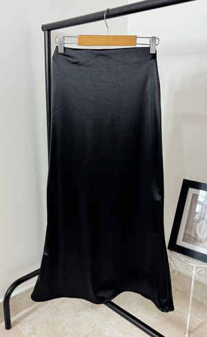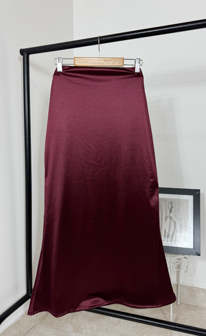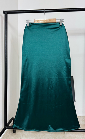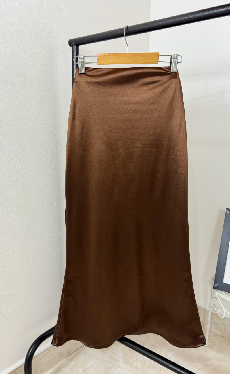 La falda midi confeccionada en licra satinada es una prenda elegante y versátil que se adapta perfectamente a distintas siluetas.