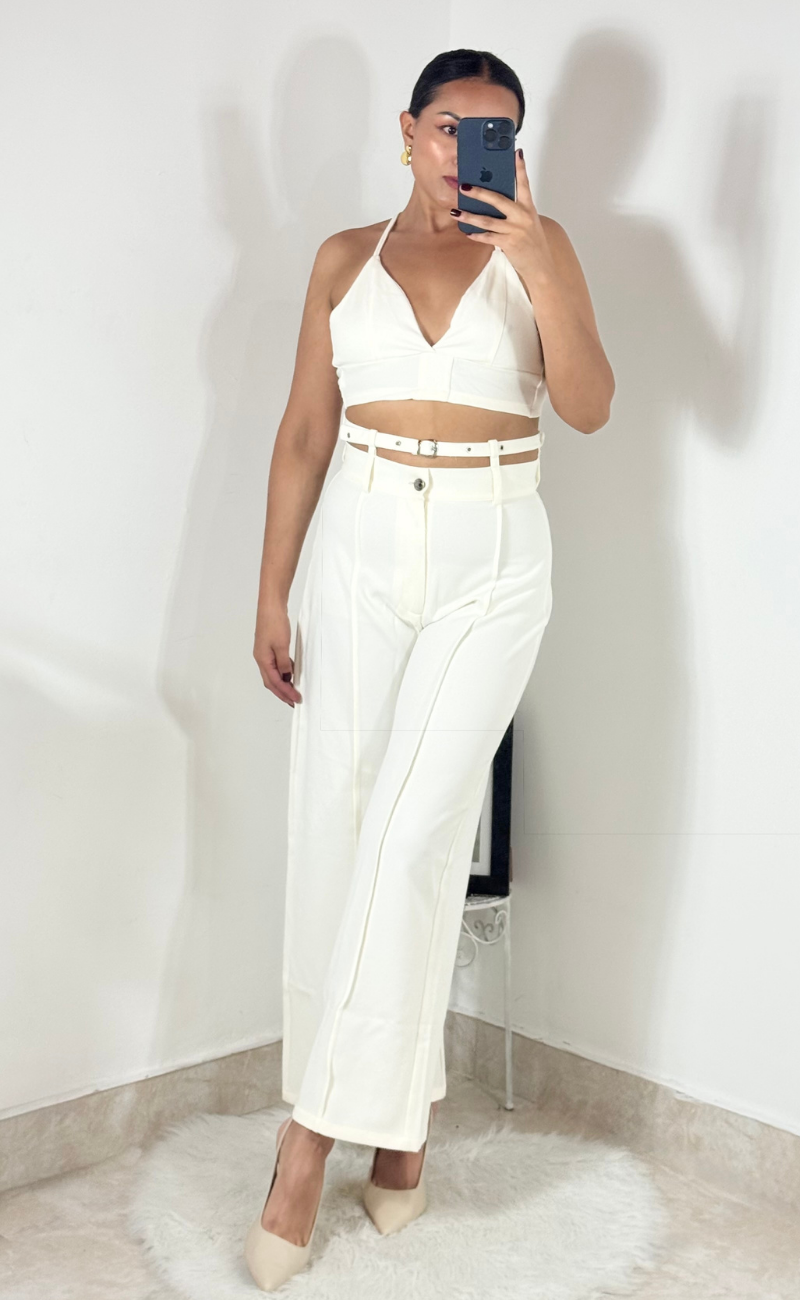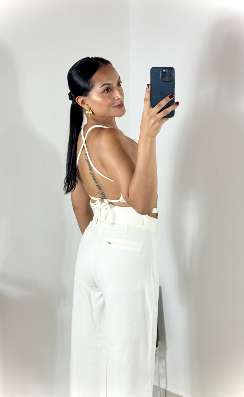 Inicio PRODUCTOS Set elegante de pantalón tiro alto y top escote en V en paño ligero