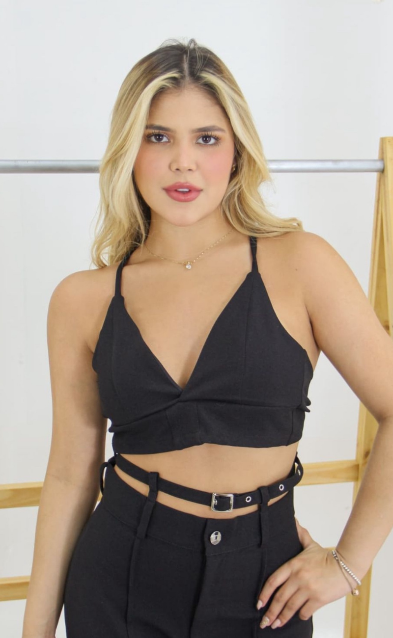 El top con escote en V aporta un toque femenino y sofisticado, mientras que sus tiras ajustables en la espalda permiten adaptarlo perfectamente a tu silueta.