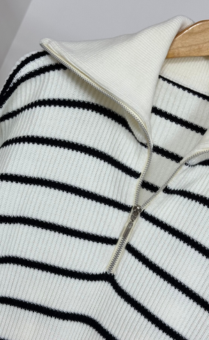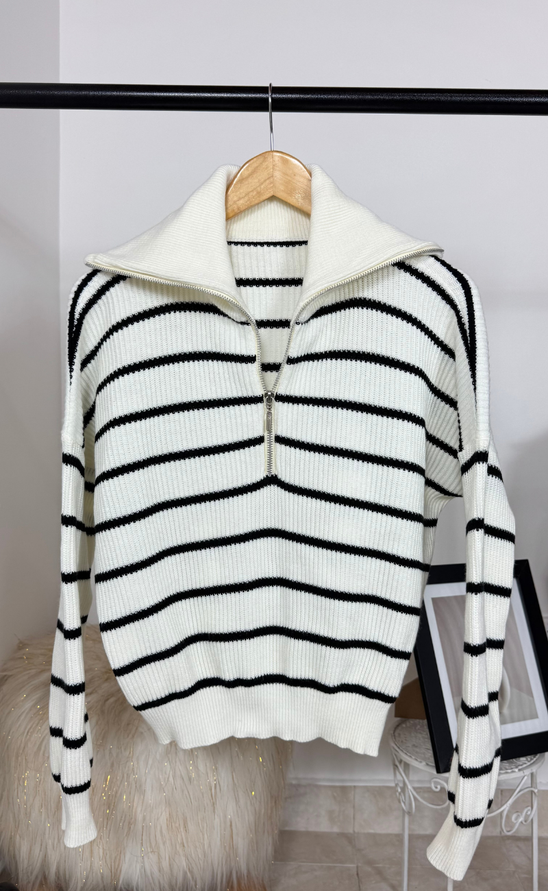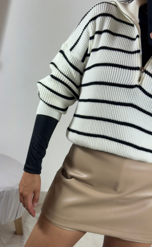 Su silueta suelta de talla única se adapta cómodamente a diferentes cuerpos, mientras que el cuello estructurado y la cremallera metalizada le dan un toque moderno y versátil. Ideal para usar en la oficina o en tu día a día, este tejido eleva tu look con poco esfuerzo y mucho estilo.