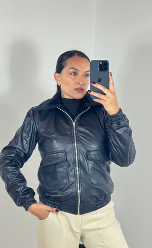 Esta chaqueta en cuerotex combina estilo cool con funcionalidad real. El forro interno afelpado en peluche suave te mantiene calientita sin renunciar a la actitud, mientras que los bolsillos laterales guardan tus cosas con estilo.