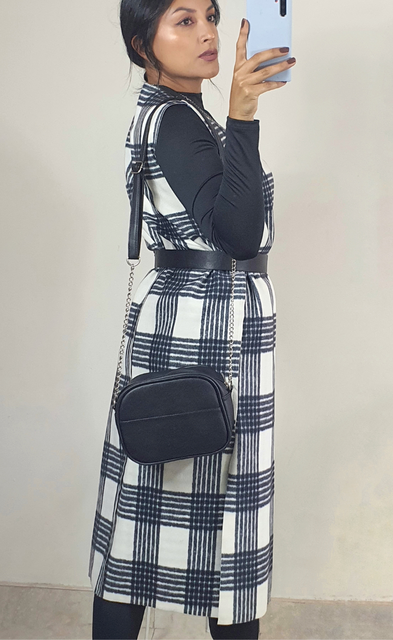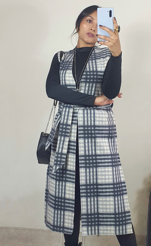 Maxichaleco reversible confeccionado en paño y tafetán que combina calidez y versatilidad.