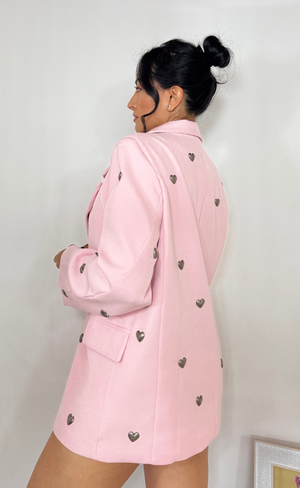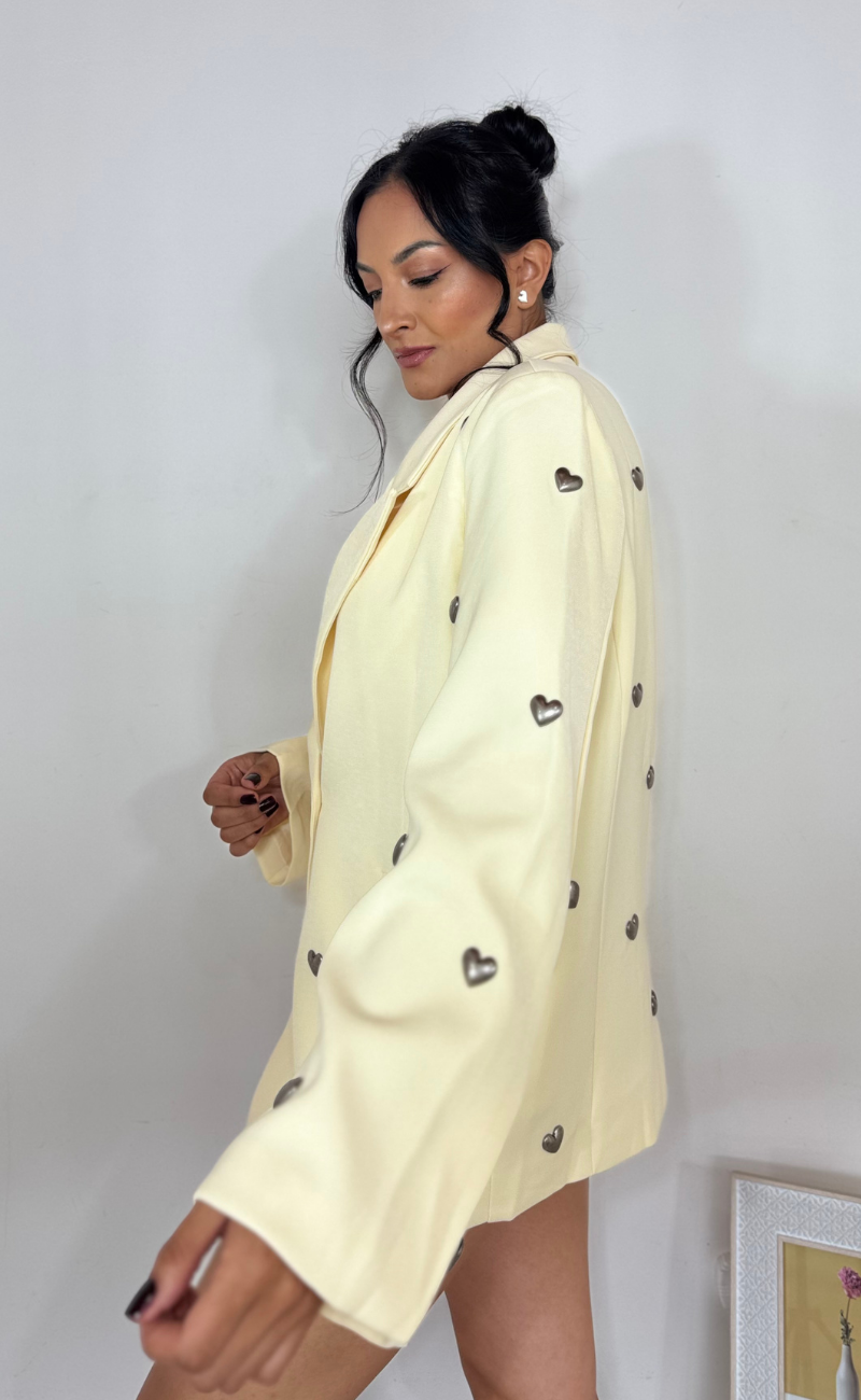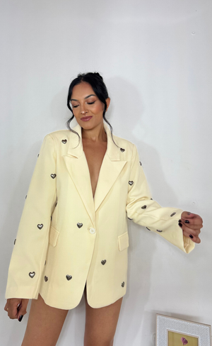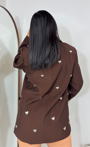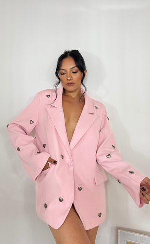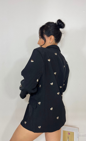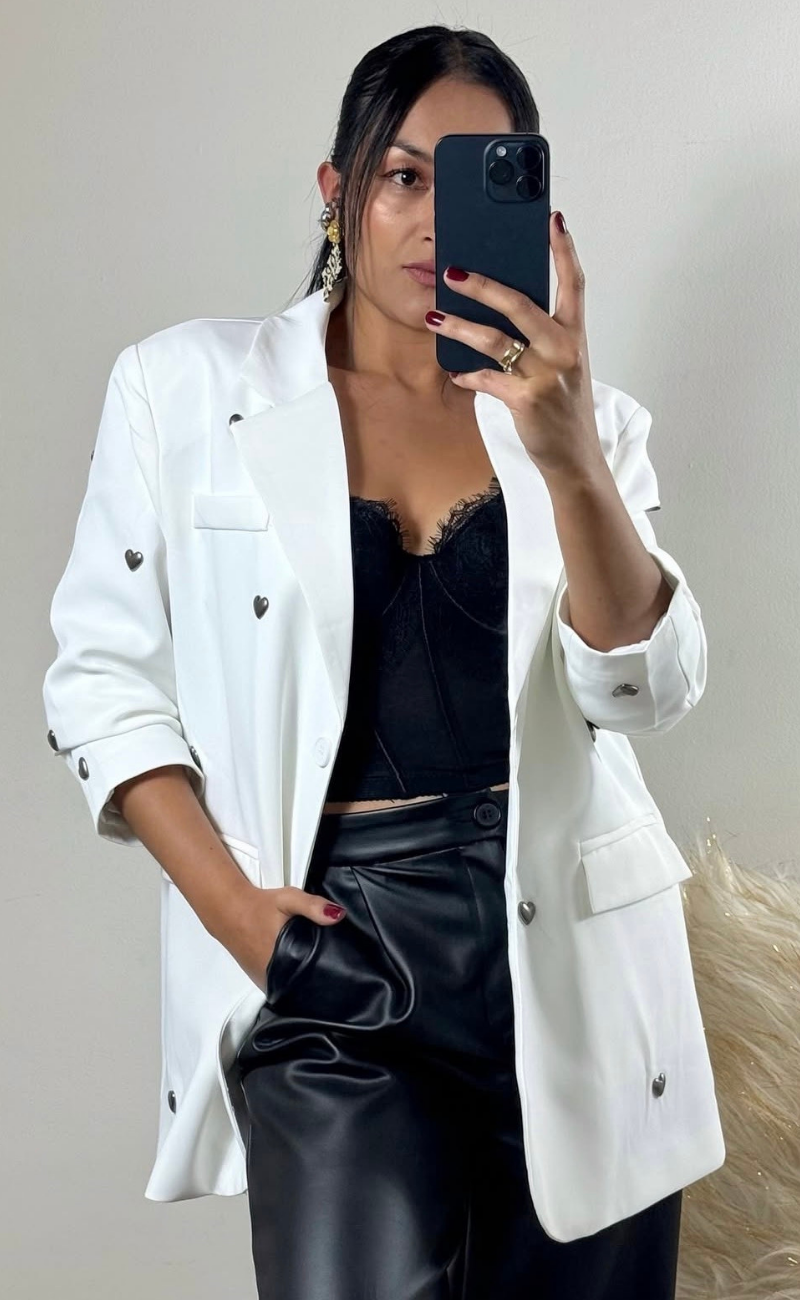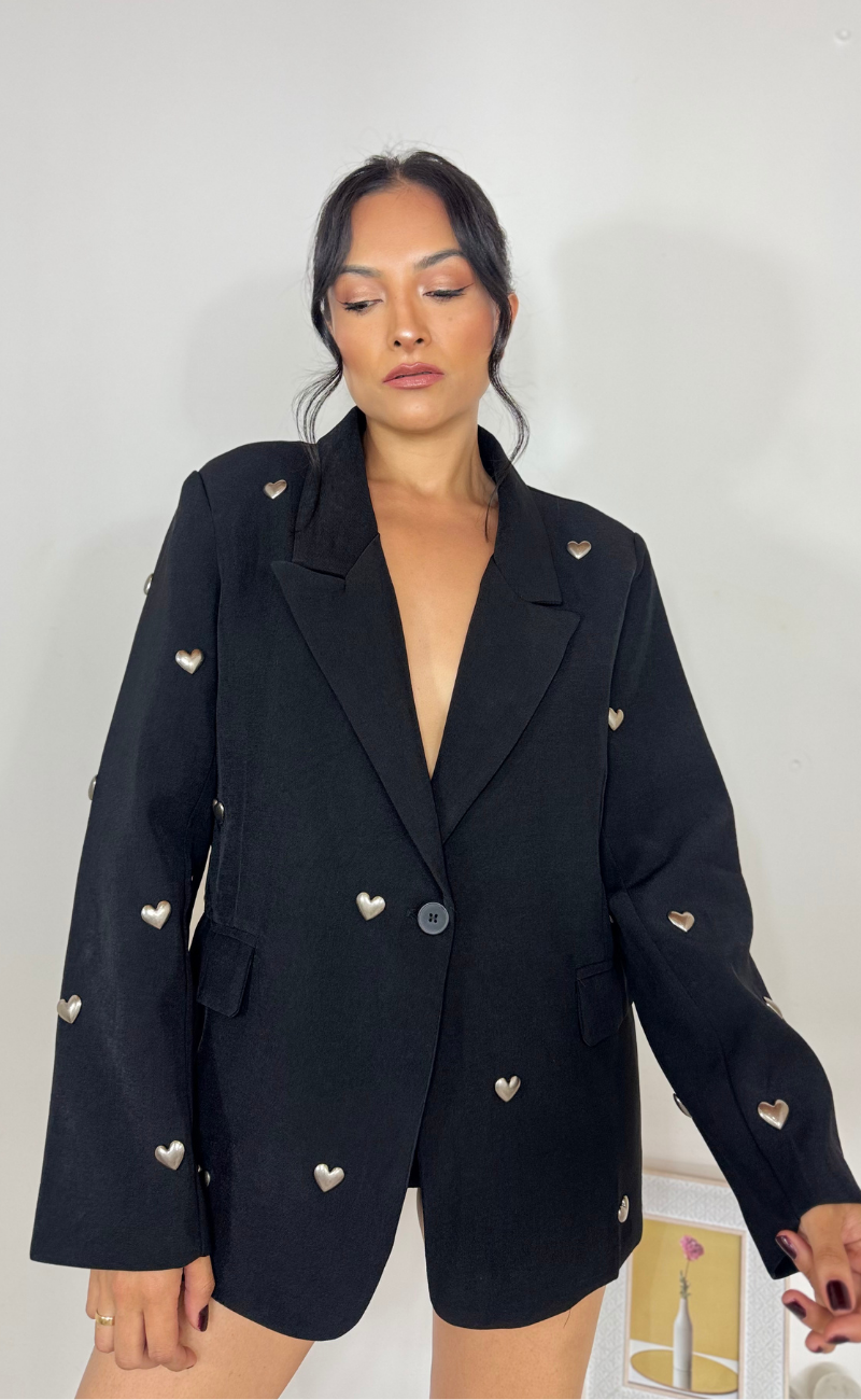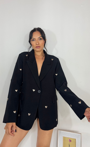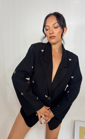 El detalle protagonista son los corazones tipo tache metálicos, que aportan un toque moderno, femenino y audaz. Ideal para mujeres que aman destacar y transformar looks sencillos en outfits poderosos y llenos de personalidad.