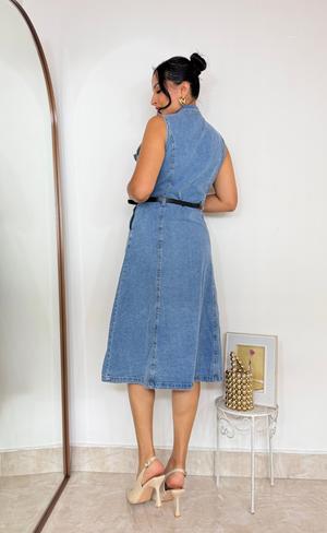 Vestido midi de corte A en jean ligero que combina elegancia romántica con versatilidad práctica.